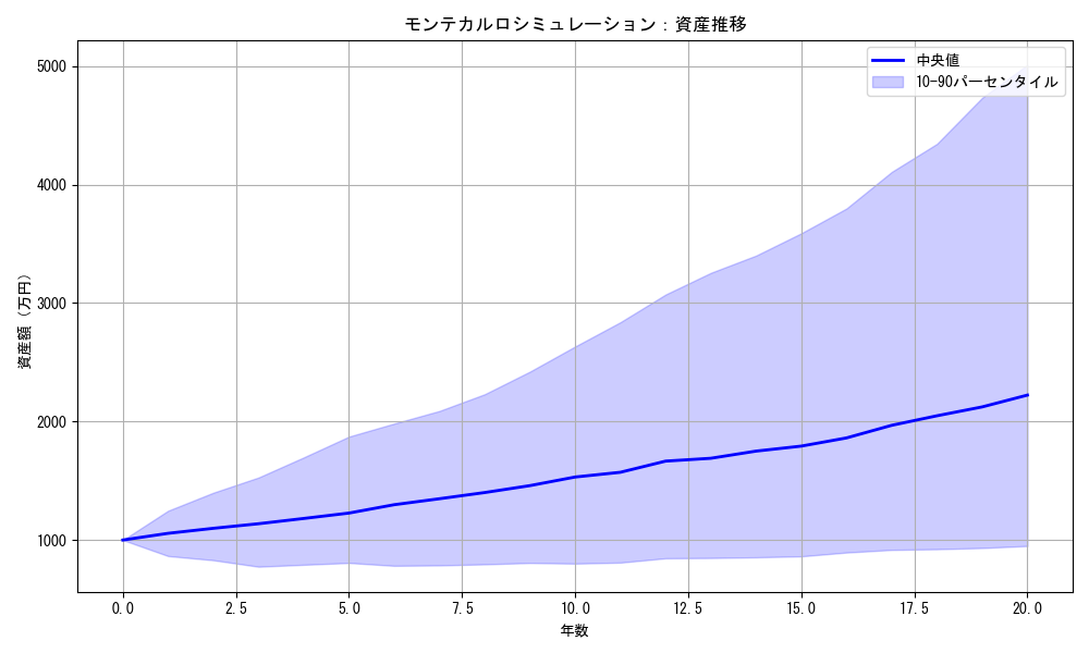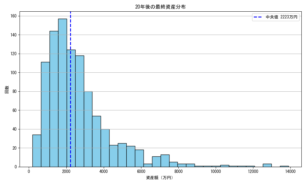 - 中央値ベースでは、20年後に資産は約2,233万円に成長