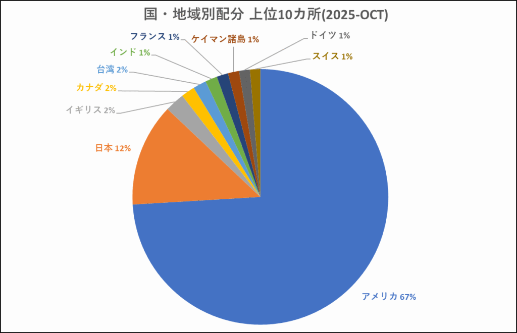 私のアセットアロケーションは全世界株式が約3割、米国系の投資信託が2割を占めるようになりました。オルカンの構成も約64%が米国株のため、加えて保有しているVYM・SPYD・HDV・EDVを含めると全体として米国株比率はかなり高めになっています。つまり現状の投資構成は「成長性重視の米国中心型」といえます。リスク許容度の高い人向けの構成かと思いますが、投資方針は人それぞれ。必ず自己判断でポートフォリオを組むことをおすすめします。