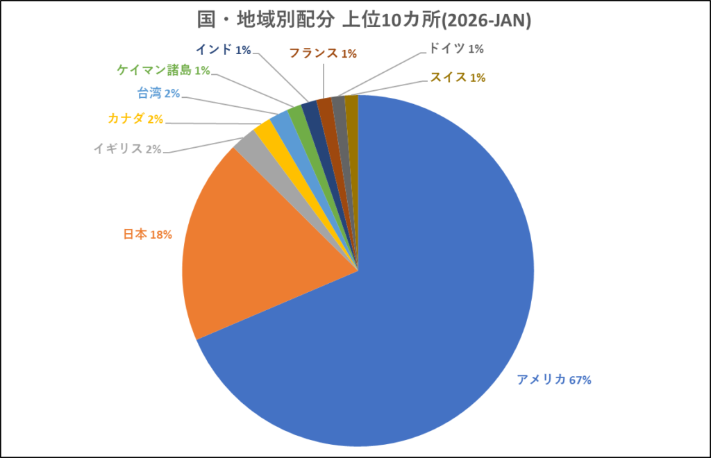 投資先の地域比率もアメリカ中心です。今回は日本株が大きく伸びたので日本の比率が3%増えました。といってもこれも一時のことだと思います。最終的にはオルカンの投資先地域比率に沿う形で変動していくと思います。